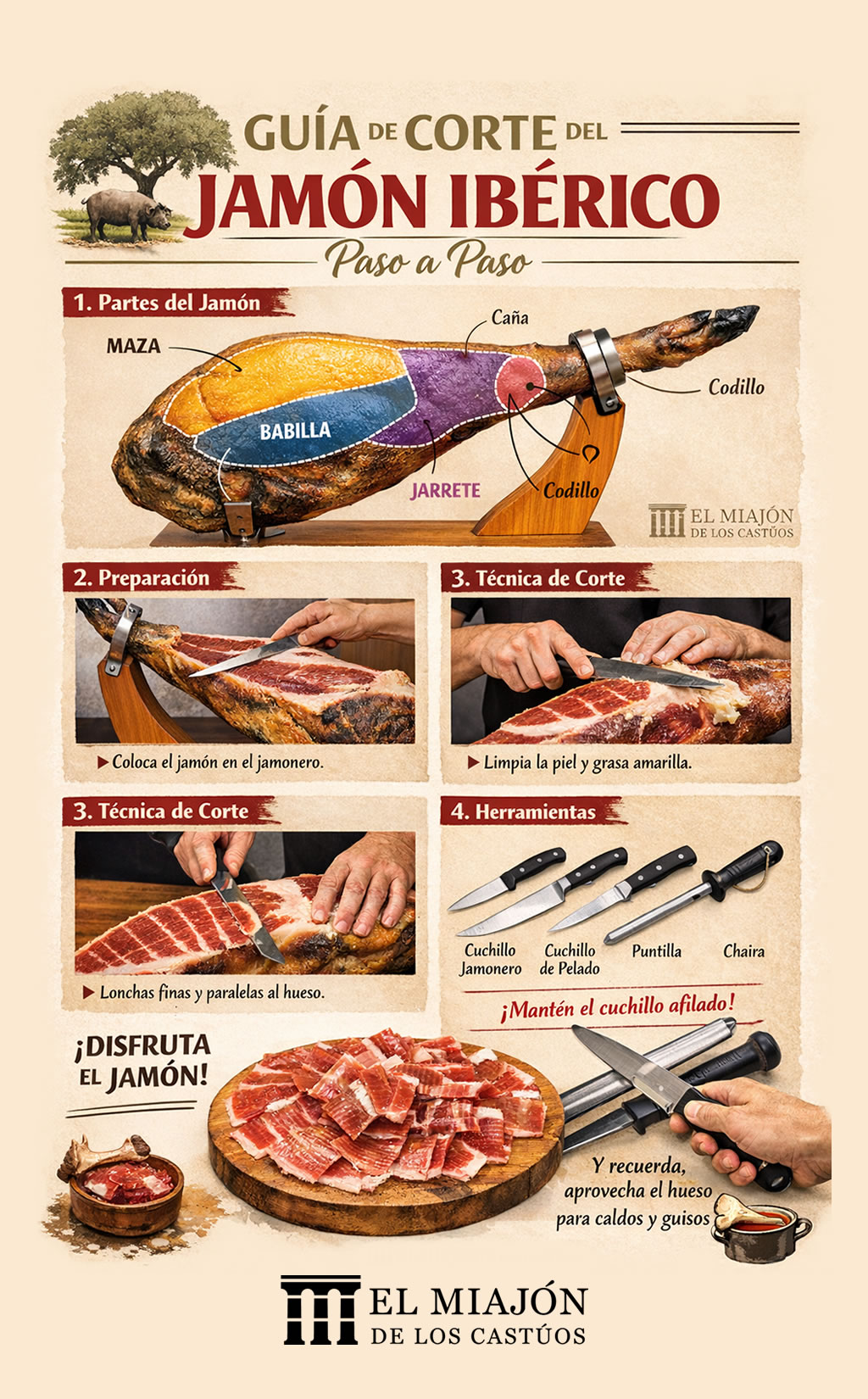 Cortar jamón ibérico es más que una técnica: es un homenaje gastronómico que combina tradición, paciencia y precisión. Dominar el corte te permite: